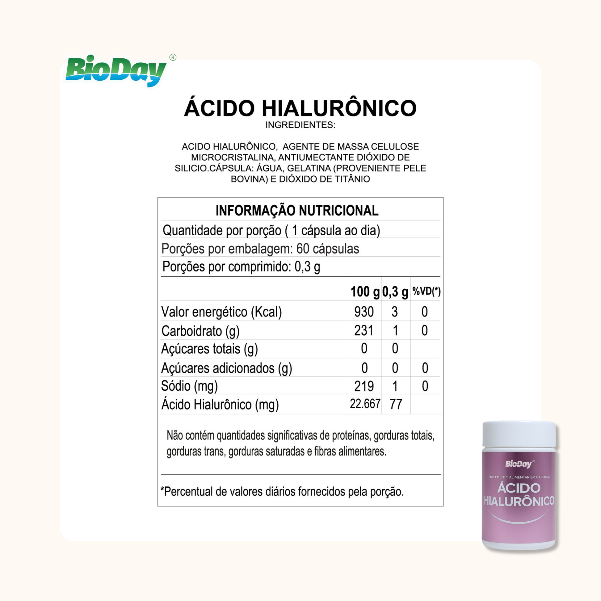 - Ácido Hialurônico (60 cápsulas): substância naturalmente presente no organismo, responsável por manter a hidratação e firmeza da pele. Atua de dentro para fora, auxiliando na retenção de água, reduzindo rugas e linhas de expressão e promovendo uma aparência mais jovem e revitalizada.