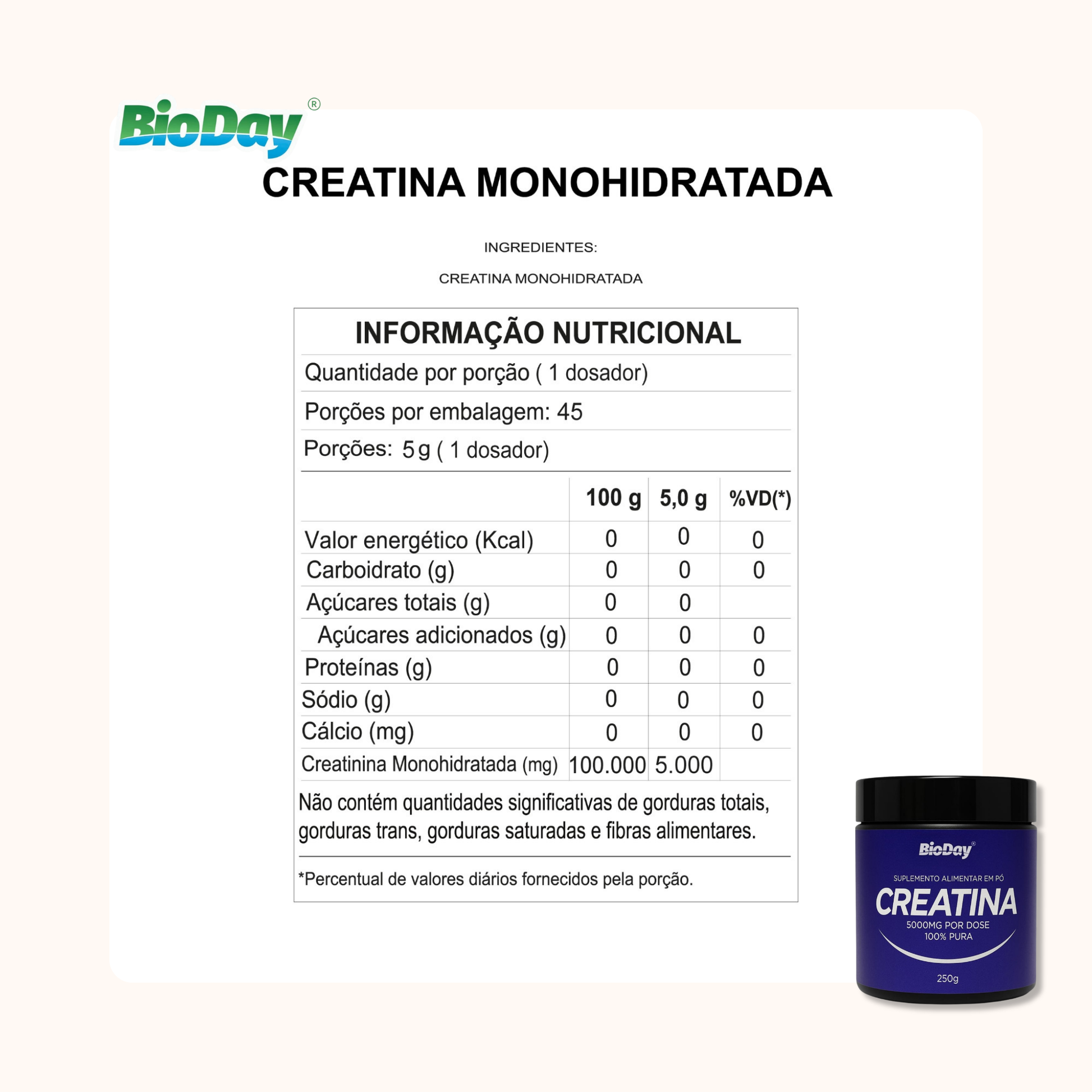 - Creatina 100% Pura (250 g): suplemento de alta qualidade que auxilia no aumento da força e da resistência muscular, além de favorecer o desempenho em treinos intensos. Com 5000 mg por dose, contribui para a recuperação pós-exercício e manutenção da massa magra, sendo ideal para quem busca resultados visíveis e sustentáveis.
