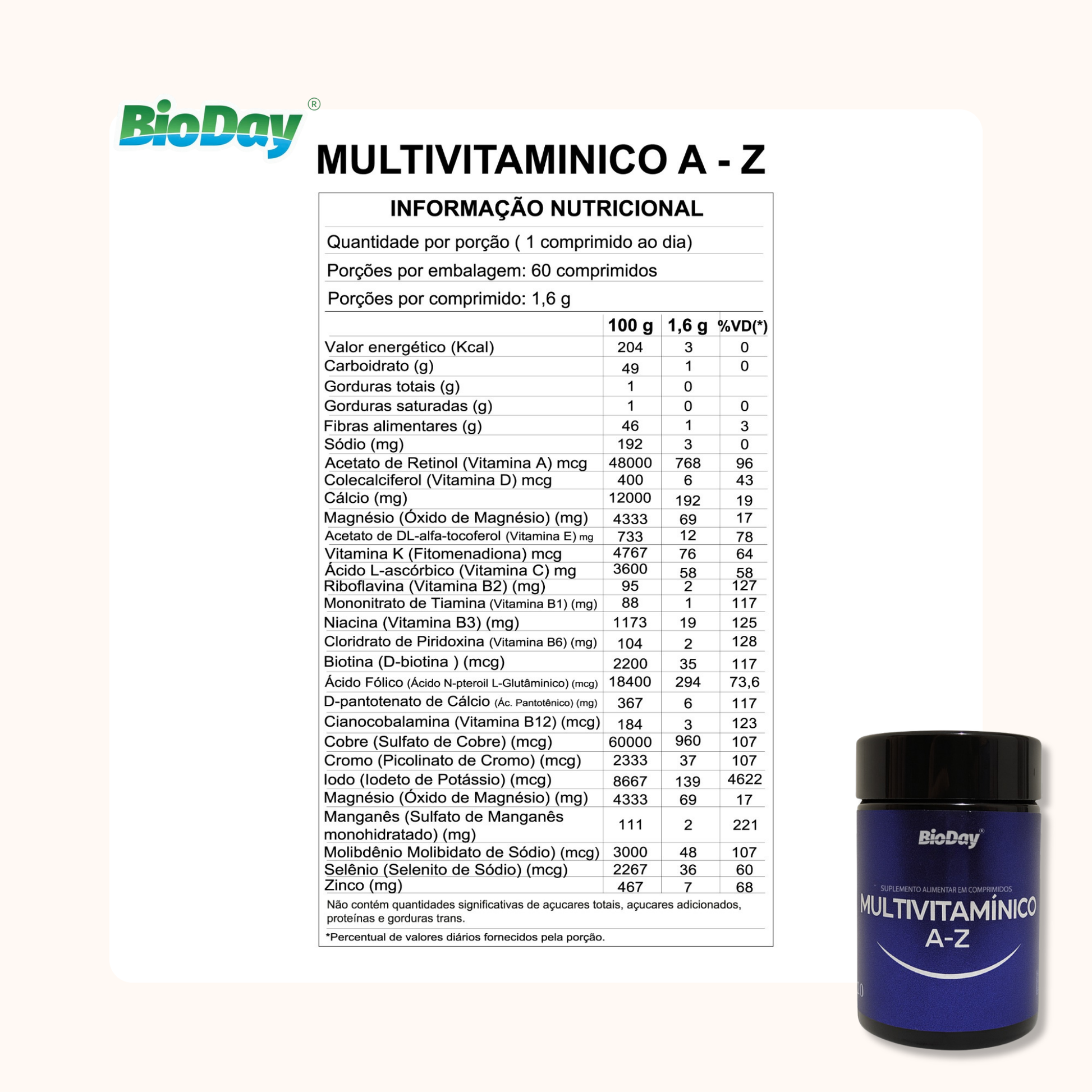 - Multivitamínico (60 comprimidos): fórmula completa de vitaminas e minerais que reforçam o sistema imunológico, combatem o cansaço e ajudam a manter o metabolismo equilibrado. Suporte diário para energia, foco e resistência física e mental.