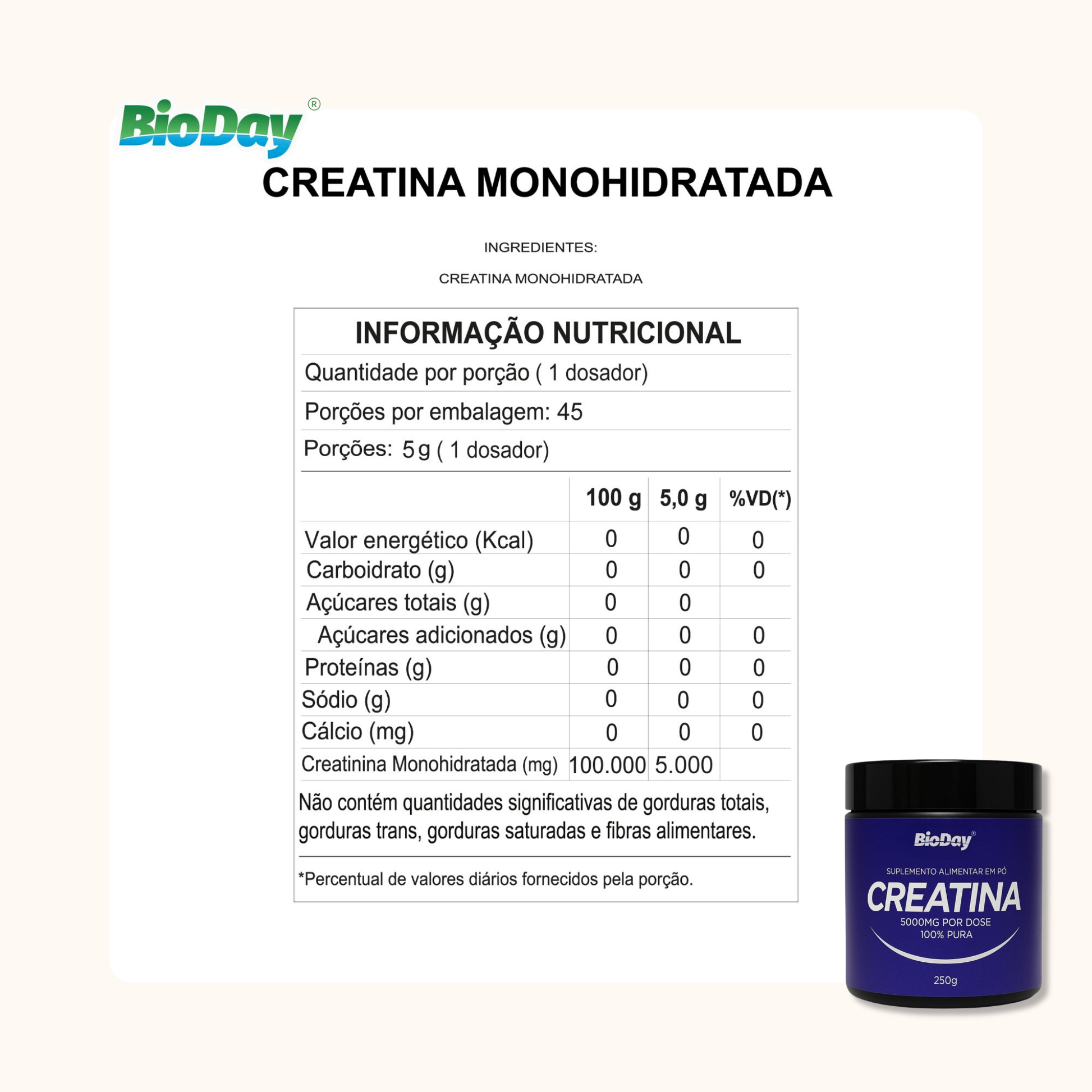 - Creatina (250 g): suplemento 100% puro que melhora a força, resistência e recuperação muscular, favorecendo o desempenho em treinos intensos e auxiliando na manutenção da massa magra.