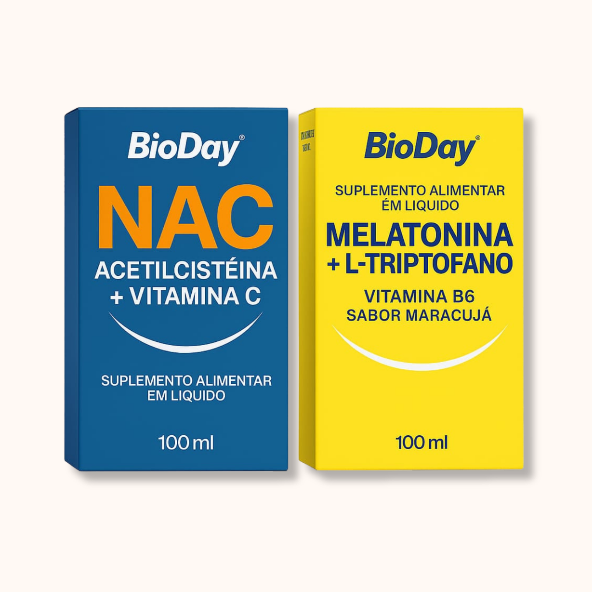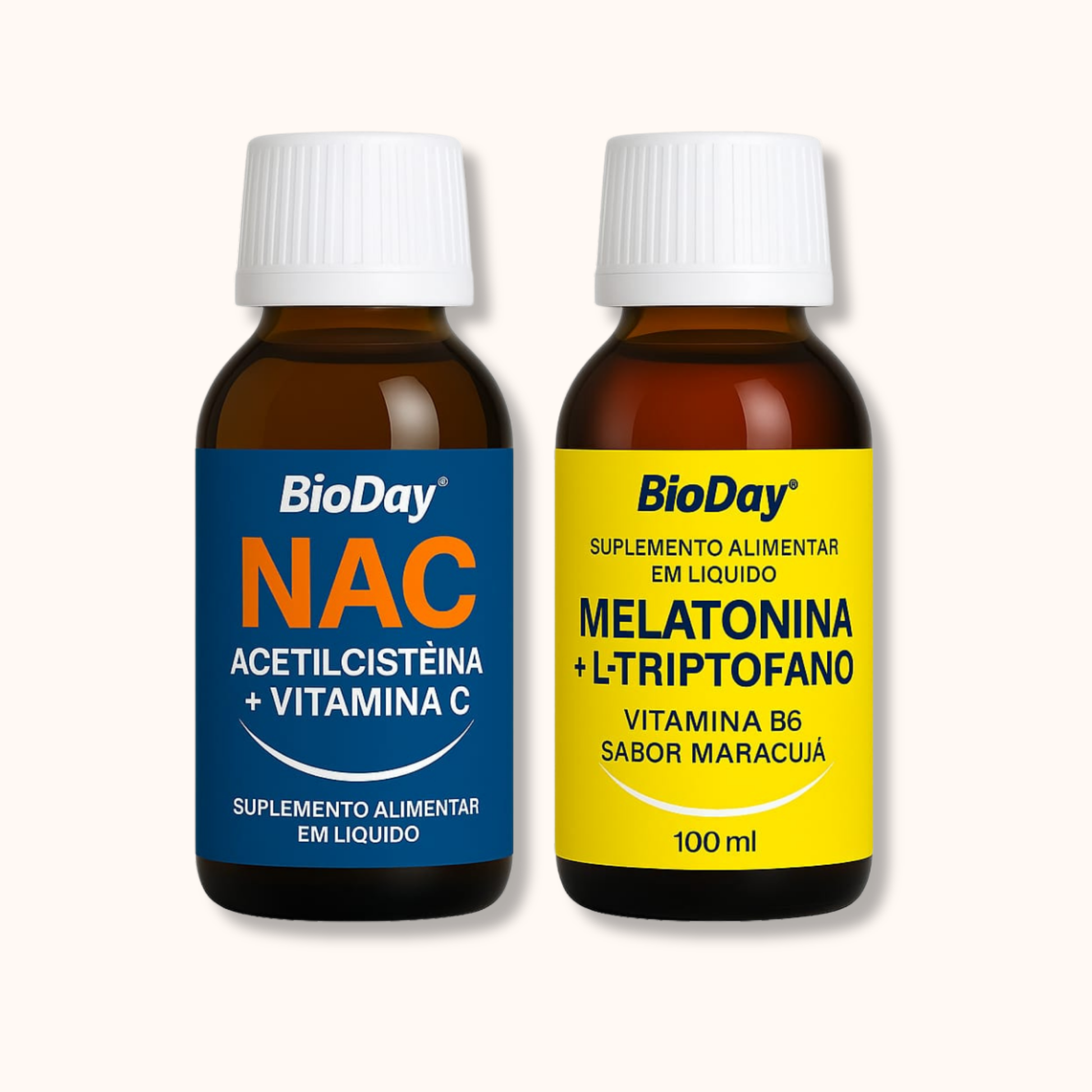 O Combo Sono Tranquilo combina dois suplementos em xarope — NAC (N-acetilcisteína) + Vitamina C (100ml) e Melatonina + L-Triptofano + Vitamina B6 (100ml) — para proporcionar noites mais calmas, sono restaurador e fortalecimento do organismo. Essa dupla age em sinergia: promove relaxamento, alívio do estresse e reforça o sistema imunológico, contribuindo para o equilíbrio físico e mental.