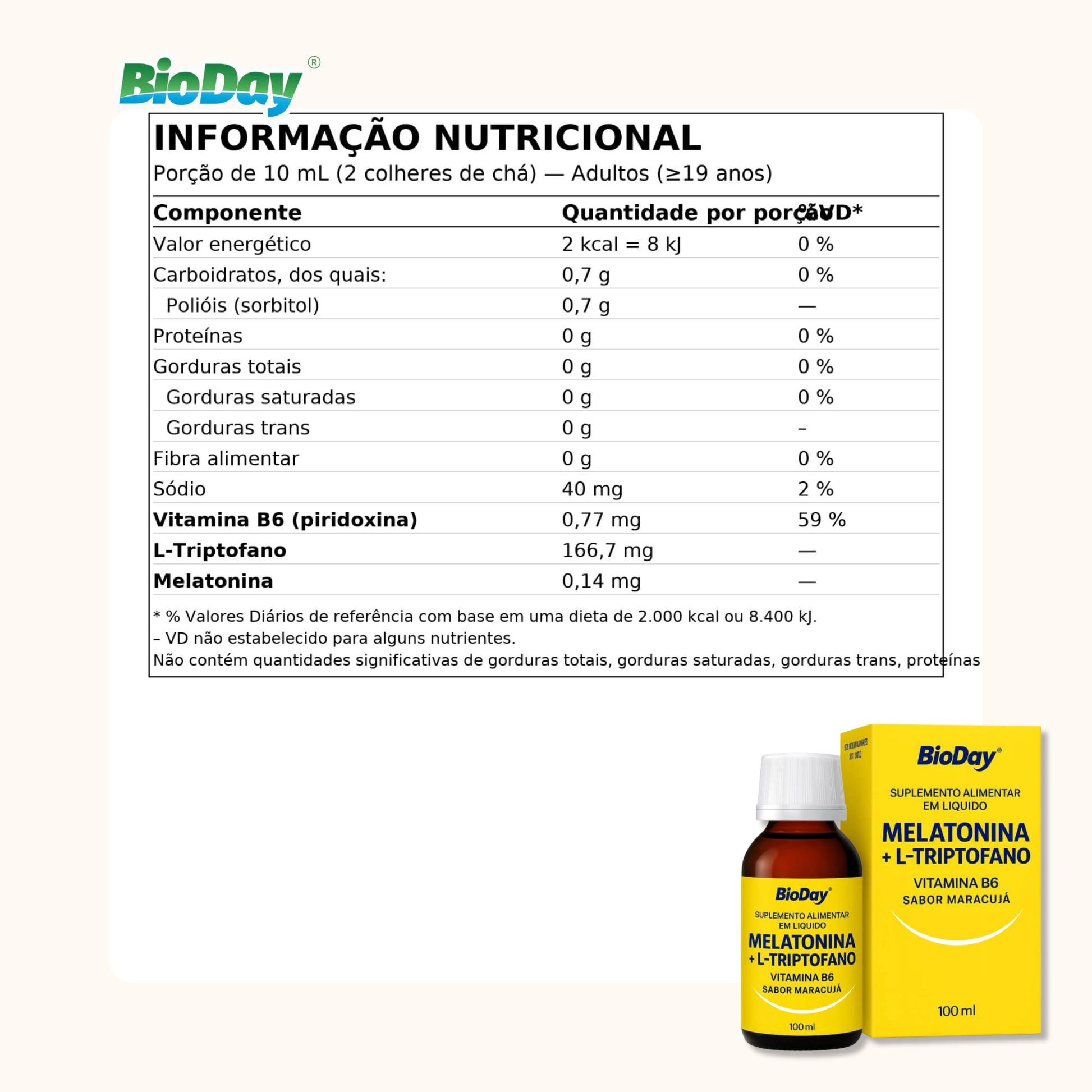 - Melatonina + L-Triptofano + Vitamina B6 (100 ml): fórmula líquida desenvolvida para promover relaxamento profundo e sono contínuo. A melatonina regula o ciclo do sono, o L-Triptofano auxilia no equilíbrio do humor e a vitamina B6 favorece o bom funcionamento neurológico.